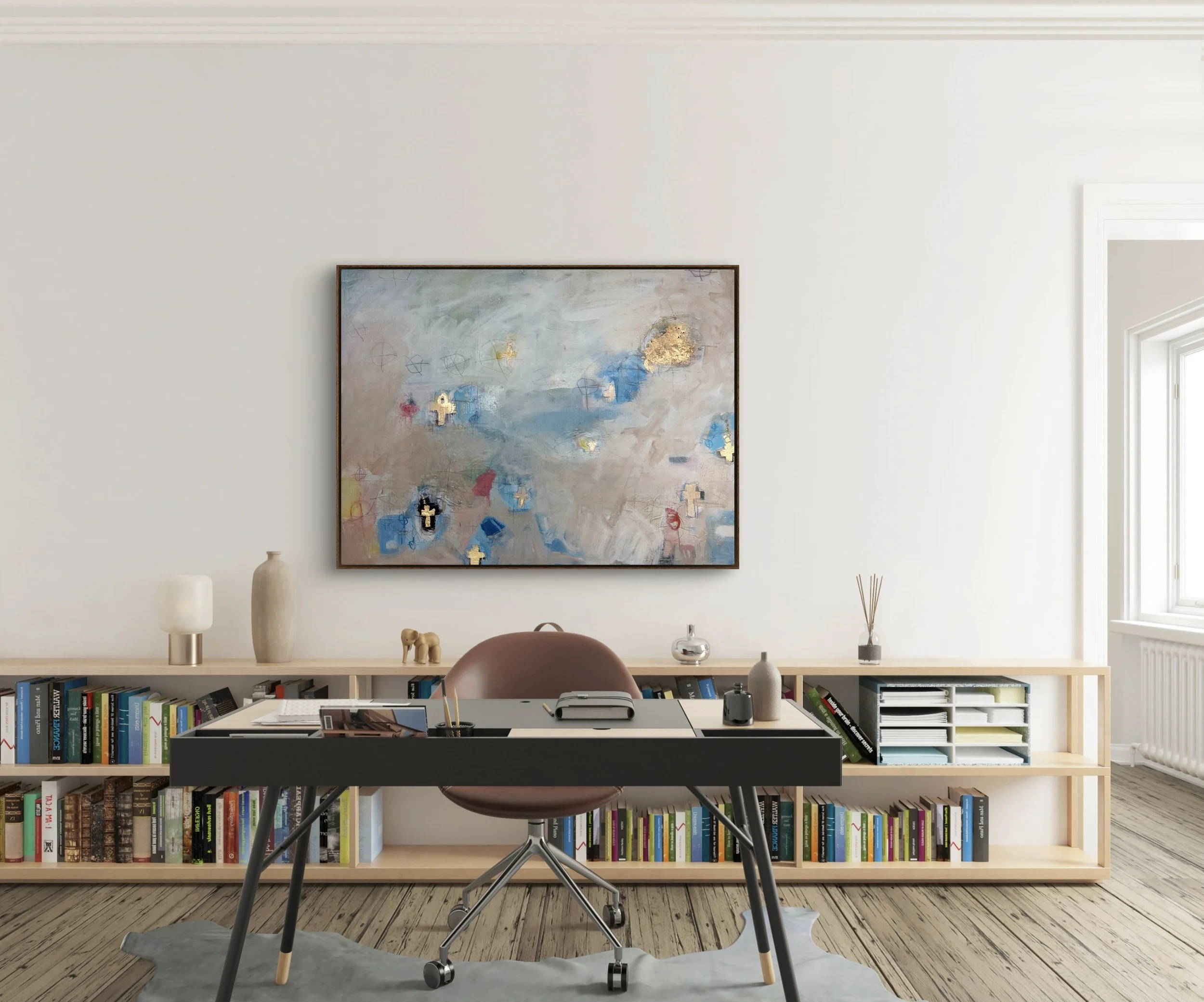 As the inaugural piece in the Communion of Saints series, this work sets the tone for a contemplative visual language rooted in reverence, mystery, and memory. Layers of muted blues and earth tones drift across the canvas like clouds of incense, gently obscuring and revealing what lies beneath. Gold leaf crosses emerge as sacred markers—shimmering testaments to the unseen and the eternal. Loosely sketched circles float like souls in quiet orbit, while soft textures evoke the spiritual veil between worlds. It is a painting of presence and passage, of light breaking through the obscured.