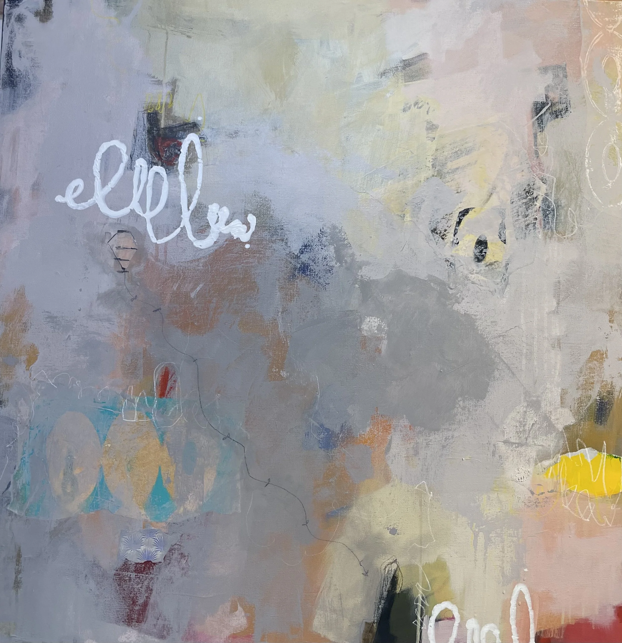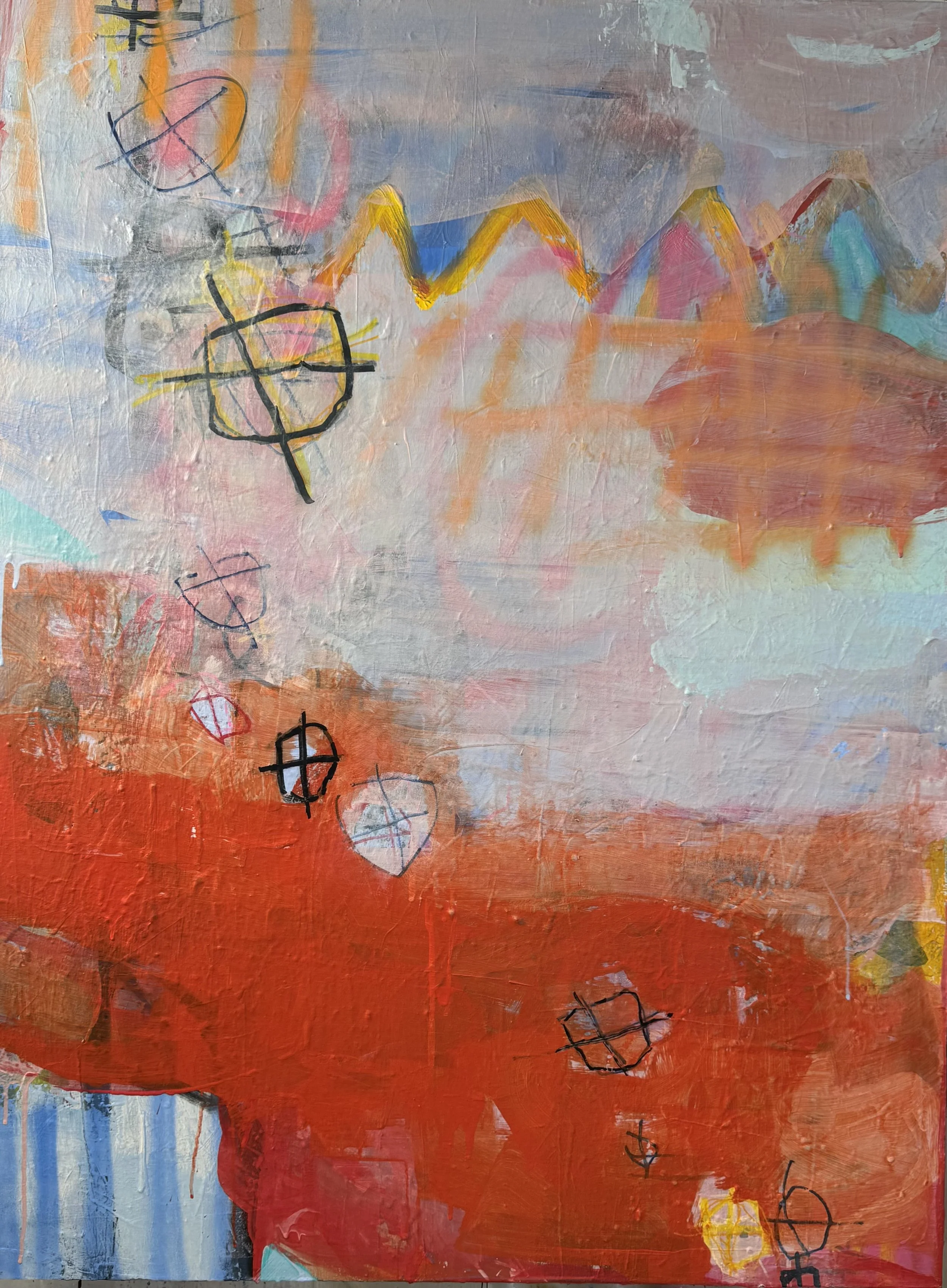 A layered composition of crimson, chalky lilac, and gestural mark-making, Saints Among Us explores the quiet presence of the sacred woven into everyday life. Bold cross-like symbols rise through fields of red and soft haze, suggesting a procession of unseen guides or messengers. This piece speaks to the grounding of spiritual grace within earthly terra